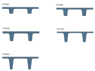 Detalii: Elementele ERGON TTP au secţiuni cu nervuri şi suprafaţa inferioară netedă. Curbura datorată pretensionării este compensată de creşterea stratului de suprabetonare spre capete. În lungul elementului ultimii 2,5 m au o creştere a grosimii de la 80 mm la 120 mm, în aşa fel încât suprafaţa este perfect orizontală în lungul elementului.